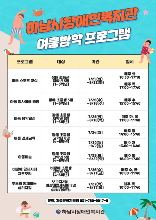 하남시장애인복지관, 장애아동 가족 대상 여름방학 특강 운영 페이지 정보 작성자 하남시장애인복지관 작성일23-07-11 09:21 조회수101 본문 하남시장애인복지관(관장 민복기)은 장애아동과 가족 대상으로 오는 7월 25일부터 8월 22일까지 여름방학 특강을 운영함에 따라 장애아동 대상 경제교육, 아동미술, 업사이클 공방, 스포츠 교실, 음악교실과 장애가족대상 부모와 비장애아동 미술심리지원, 비장애형제자매 자조모임등 총 7개 프로그램(총 38명)을 선착순으로 모집하여 진행될 예정입니다. 기사원문보기 목록 이전글 하남시장애인복지관 주간보호센터, 자기주장권리대회 대상수상 23.07.18 다음글 시립미사인스빌어린이집 하남시장애인복지관에 장애인가정을 위한 후원금 전달 23.07.11