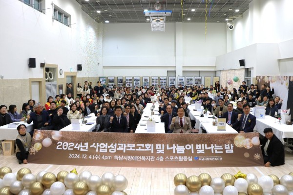 하남시장애인복지관, 후원자 및 자원봉사자와 함께한 2024년 사업성과보고회 및 나눔이 빛나는 밤 개최 페이지 정보 작성자 하남시장애인복지관 작성일24-12-09 09:15 조회수124 본문 하남시장애인복지관이 지난 12월 4일, 복지관 스포츠활동실에서 후원자와 자원봉사자를 초청하여 ‘2024년 사업성과보고회 및 나눔이 빛나는 밤’ 행사를 성공적으로 개최하여 촬영한 사진입니다.기사원문보기 목록 이전글 처갓집 양념치킨 미사역점, 하남시장애인복지관에 치킨 후원품 기부 25.01.14 다음글 하남시 장애인활동지원사 힐링콘서트 성료, 소속감과 재충전의 시간 24.12.09
