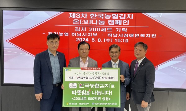 경기농협본부 “온(溫) 나눔 캠페인” 농협김치 200세트 하남시장애인복지관에 전달 페이지 정보 작성자 하남시장애인복지관 작성일24-05-13 11:24 조회수94 본문 농협경기본부가 한국농협김치 출범 2주년을 기념하여 “온(溫)나눔 캠페인”으로 하남시장애인복지관에 농협김치 4종(2.4Kg) 200세트를 전달하며 촬영한 사진입니다.기사원문보기 목록 이전글 별난버섯집 본점, 하남시장애인복지관에 나눔반상 후원 24.05.13 다음글 하남시장애인복지관, 아웃백 하남스타필드점과 함께하는 러브백 캠페인! 러브백 아웃백 데이 진행 24.05.09