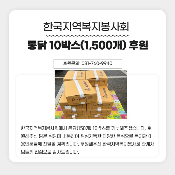 후원내역 한국지역복지봉사회 통닭 10박스(1,500개) 후원