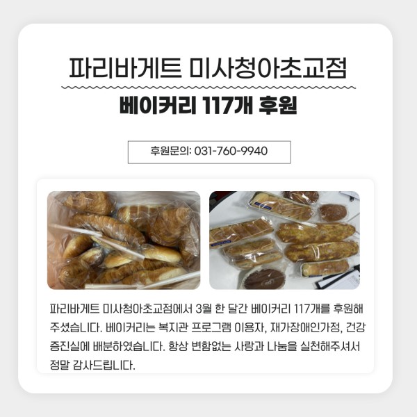 후원내역 파리바게트 미사청아초교점 베이커리 117개 후원