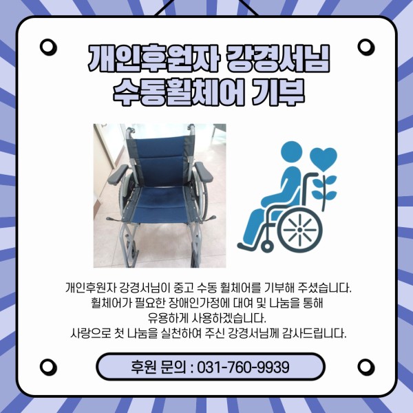 개인후원자 강경서님이 중고 수동 휠체어를 기부해 주셨습니다.