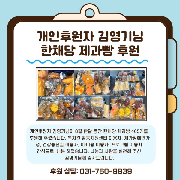 개인후원자 김영기님이 8월 한달 동안 한채당 제과빵 465개를