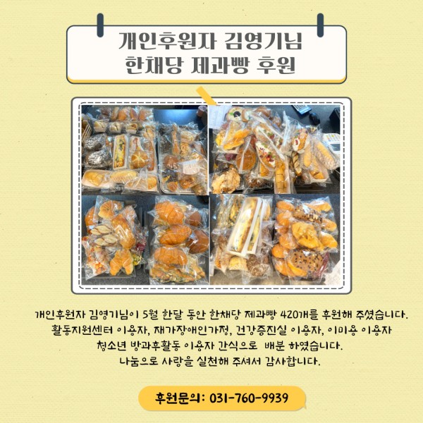 개인후원자 김영기님이 5월 한달 동안 한채당 제과빵 420개를 후원해 주셨습니다.
