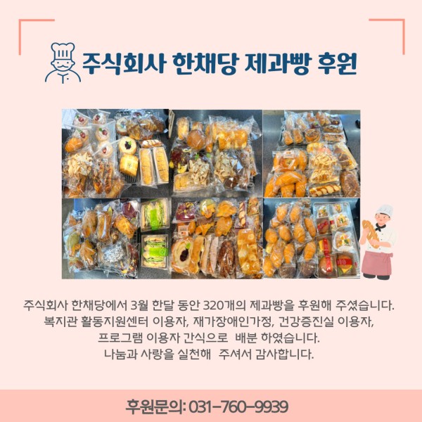 주식회사 한채당에서 3월 한달 동안 320개의 제과빵을 후원해 주셨습니다.