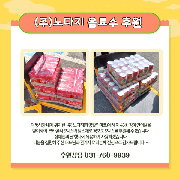 맞이하여 코카콜라 5박스와 탐스제로 청포도 5박스를 후원해 주셨습니다