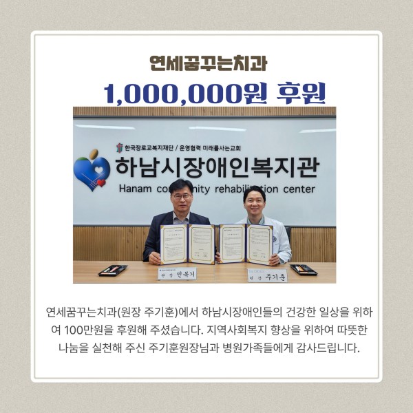 후원내역 연세꿈꾸는치과 페이지 정보 작성자 하남시장애인복지관 작성일25-05-28 19:37 조회수107 본문 자세히 보기 연세꿈꾸는치과(원장 주기훈)에서 하남시장애인들의 건강항 일상을 위하여 100만원을 후원해 주셨습니다. 지역사회복지 향상을 위하여 따뜻한 나눔을 실천해 주신 주기훈원장님과 병원가족들에게 감사드립니다. 목록 이전글 연세꿈꾸는치과 25.06.10 다음글 연세꿈꾸는치과 25.05.28