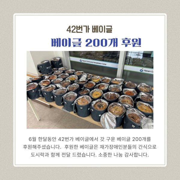 후원내역 42번가 베이글 페이지 정보 작성자 하남시장애인복지관 작성일25-07-02 12:54 조회수78 본문 6월 한달동안 42번가 베이글에서 갓 구운 베이글 200개를 후원해주셨습니다. 후원한 베이글은 재가장애인분들의 간식으로 도시락과 함께 전달 드렸습니다. 소중한 나눔 감사합니다. 목록 이전글 한채당베이커리 25.07.02 다음글 더해피 25.06.23