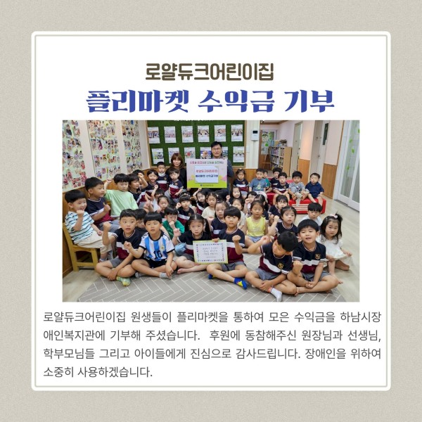 후원내역 로얄듀크어린이집 페이지 정보 작성자 하남시장애인복지관 작성일25-07-02 13:02 조회수77 본문 로얄듀크어린이집 원생들이 플리마켓을 통하여 모은 수익금을 하남시장애인복지관에 기부해 주셨습니다. 후원에 동참해주신 원장님과 선생님, 학부모님들 그리고 아이들에게 진심으로 감사드립니다. 장애인을 위하여 소중히 사용하겠습니다. 목록 이전글 로얄듀크어린이집 25.07.02 다음글 교촌치킨 미사역점 25.07.02