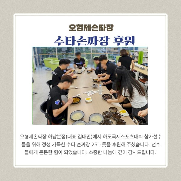 후원내역 오형제손짜장 하남본점 페이지 정보 작성자 하남시장애인복지관 작성일25-08-14 13:36 조회수260 본문 오형제손짜장 하남본점(대표 김대만)에서 하도국제스포츠대회 참가선수들을 위해 정성 가득한 수타 손짜장 25그릇을 후원해 주셨습니다. 선수들에게 든든한 힘이 되었습니다. 소중한 나눔에 깊이 감사드립니다. 목록 이전글 돌고도네이션 25.08.14 다음글 아이엔소아치과 25.08.14