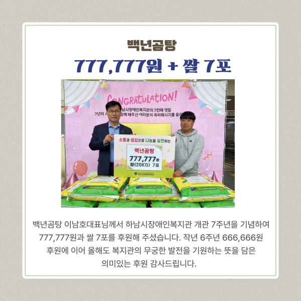 777,777원과 쌀 7포를 후원해 주셨습니다. 작년 6주년 666,666원