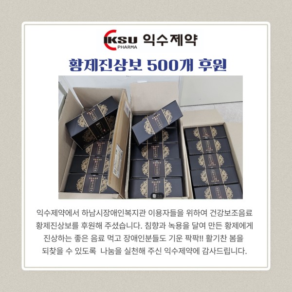 후원내역 익수제약 페이지 정보 작성자 하남시장애인복지관 작성일25-04-23 10:23 조회수95 본문 자세히 보기 익수제약황제진상보 500개 후원익수제약에서 하남시장애인복지관 이용자들을 위하여 건강보조음료황제진상보를 후원해 주셨습니다. 침향과 녹용을 달여 만든 황제에게진상하는 좋은 음료 먹고 장애인분들도 기운 팍팍 !! 활기찬 봄을되찾을 수 있도록 나눔을 실천해 주신 익수제약에 감사드립니다. 목록 이전글 (주)아이앤피 25.04.23 다음글 동원샘물 25.04.23