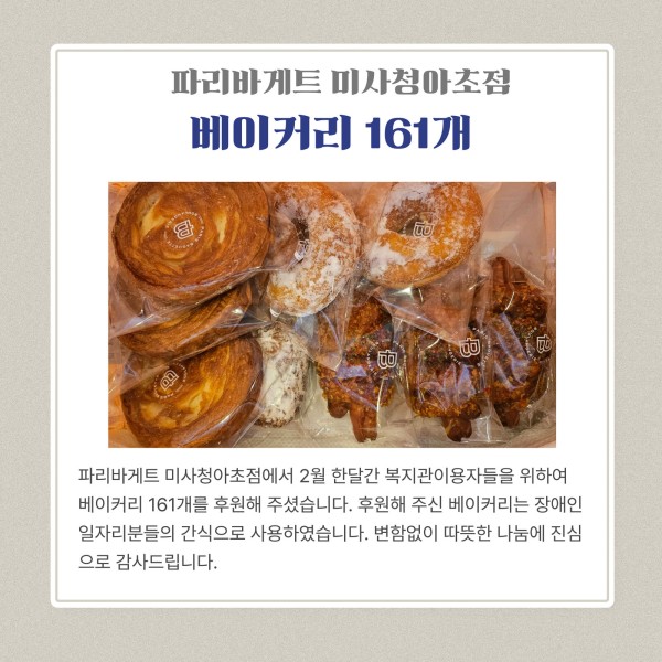 베이커리 161개를 후원해 주셨습니다. 후원해 주신 베이커리는 장애인