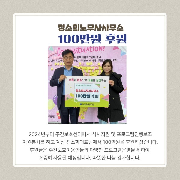 자원봉사를 하고 계신 정소희대표님께서 100만원을 후원하셨습니다.