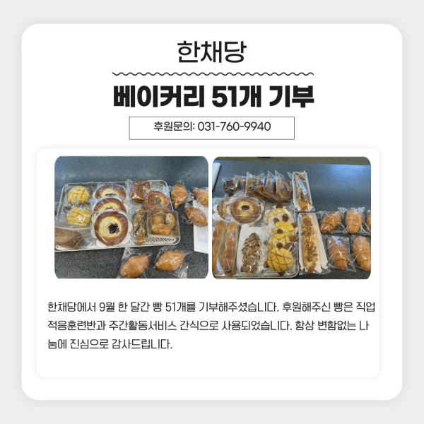 한채당에서 9월 한 달간 빵 51개를 기부해주셨습니다. 후원해주신 빵은 직업