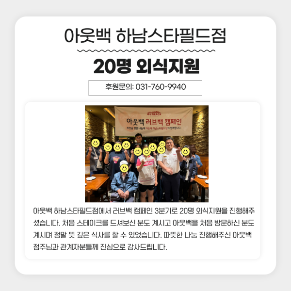 후원내역 아웃백 하남스타필드점 「아웃백 러브백 캠페인」 20명 외식지원