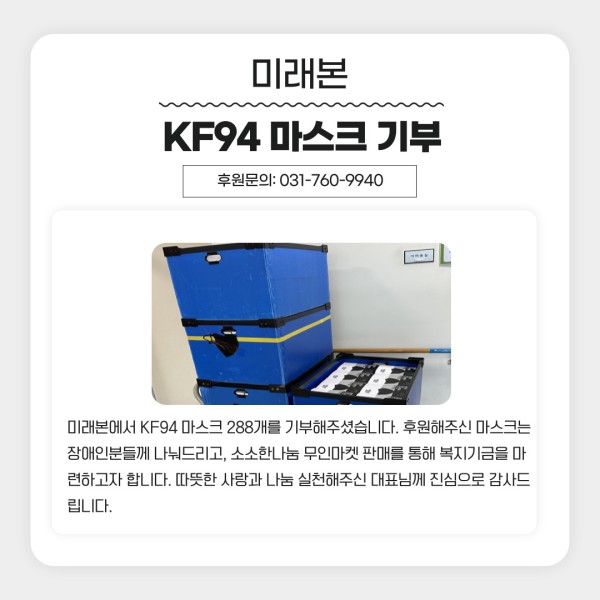 미래본에서 KF94 마스크 288개를 기부해주셨습니다. 후원해주신 마스크는