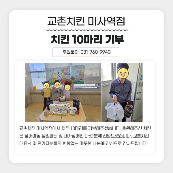 교촌치킨 미사역점에서 치킨 10마리를 기부해주셨습니다. 후원해주신 치킨