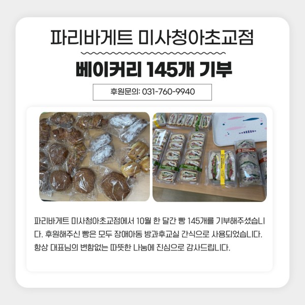 후원내역 파리바게트 미사청아초교점 10월 한 달간 베이커리 145개 기부