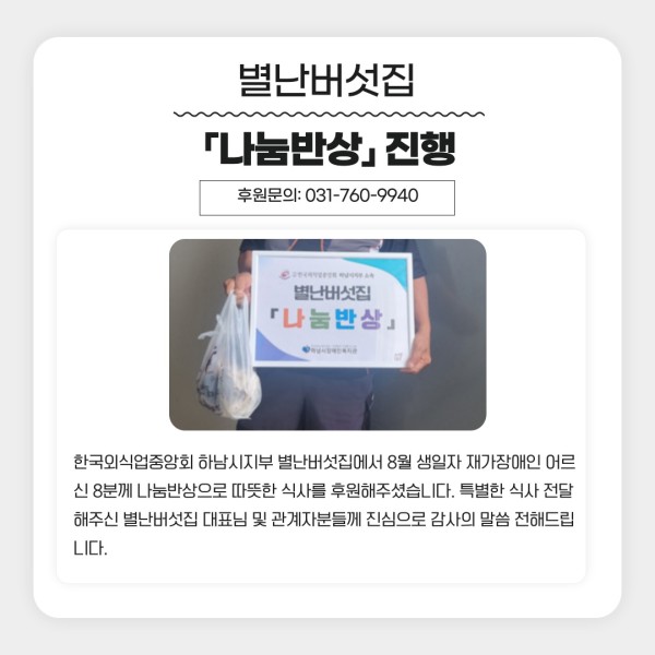 한국외식업중앙회 하남시지부 별난버섯집에서 8월 생일자 재가장애인 어르