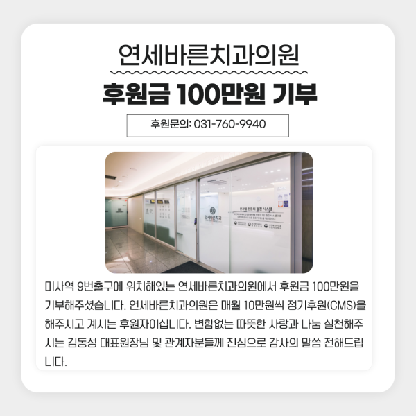 후원내역 연세바른치과의원, 후원금 100만원 기부
