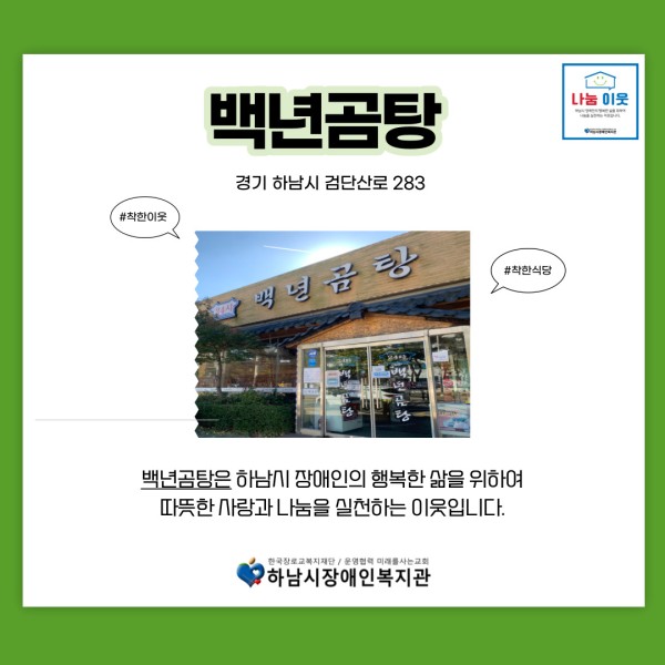 나눔이웃 백년곰탕 페이지 정보 작성자 관리자 작성일24-06-11 15:32 조회수95 본문 ● 매장 위치: 경기 하남시 검단산로 283● 나눔 관련 기사 목록 이전글 아웃백스테이크하우스 스타필드하남점 24.06.12 다음글 파리바게트 미사청아초교점 10월 한 달간 베이커리 145개 기부 24.11.04