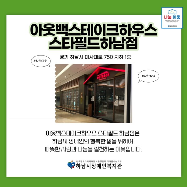 나눔이웃 아웃백스테이크하우스 스타필드하남점 페이지 정보 작성자 관리자 작성일24-06-12 10:43 조회수96 본문 ● 아웃백스테이크하우스 스타필드하남점경기 하남시 미사대로 750● 나눔 관련 소식 목록 이전글 동래복집 미사리점 24.06.12 다음글 백년곰탕 24.06.11