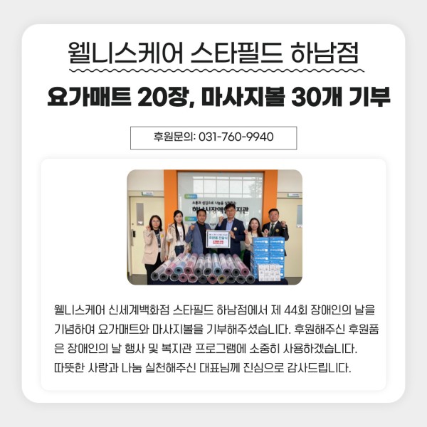 후원내역 웰니스케어 스타필드 하남점, 요가매트 20장 마사지볼 30개 기부