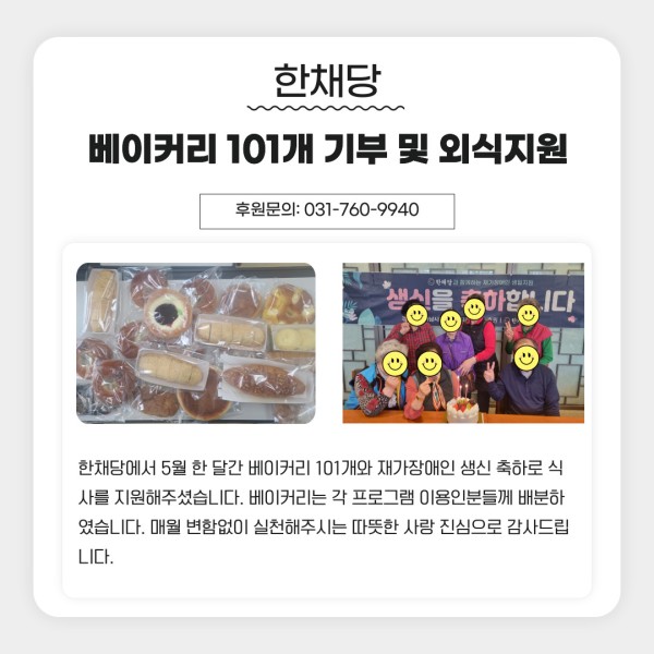 한채당에서 5월 한 달간 베이커리 101개와 재가장애인 생신 축하로 식