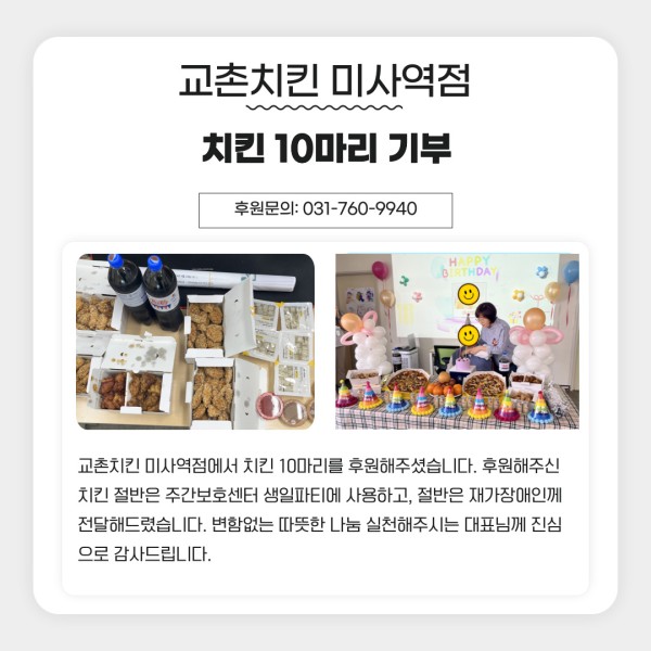교촌치킨 미사역점에서 치킨 10마리를 후원해주셨습니다. 후원해주신