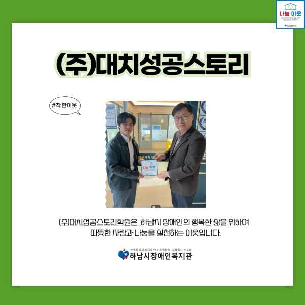 나눔이웃 (주)대치성공스토리학원 페이지 정보 작성자 하남시장애인복지관 작성일25-02-07 17:47 조회수129 본문 자세히 보기(주)대치성공스토리#착한이웃[주)대치성공스토리학원은 하남시 장애인의 행복한 삶을 위하여따뜻한 사랑과 나눔을 실천하는 이웃입니다. 검색 목록 이전글 아이엔소아치과 장애아동 무료진료 봉사 25.02.12 다음글 한국외식중앙회 하남시지부 25.02.07