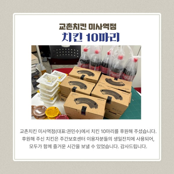 후원내역 교촌치킨 페이지 정보 작성자 하남시장애인복지관 작성일25-08-14 13:31 조회수85 본문 교촌치킨 미사역점(대표:권민수)에서 치킨 10마리를 후원해 주셨습니다.후원해 주신 치킨은 주간보호센터 이용자분들의 생일잔치에 사용되어, 모두가 함께 즐거운 시간을 보낼 수 있었습니다. 감사드립니다. 목록 이전글 42번가베이글 25.08.14 다음글 한채당 25.08.14