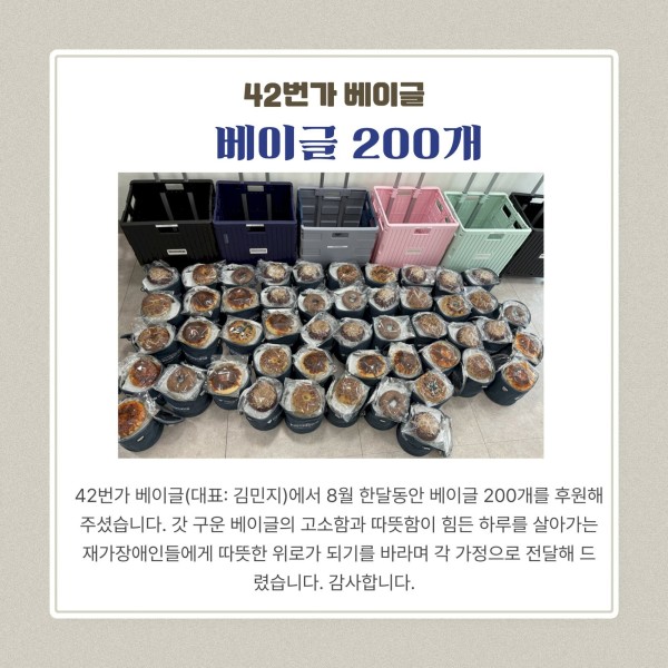 후원내역 42번가 베이글 페이지 정보 작성자 하남시장애인복지관 작성일25-09-12 17:27 조회수235 본문 42번가 베이글(대표: 김민지)에서 8월 한달동안 베이글 200개를 후원해 주셨습니다. 갓 구운 베이글의 고소함과 따뜻함이 힘든 하루를 살아가는 재가장애인들에게 따뜻한 위로가 되기를 바라며 각 가정으로 전달해 드렸습니다. 감사합니다. 목록 이전글 돌고도네이션 25.09.12 다음글 돌고도네이션 25.08.14
