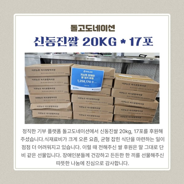 후원내역 돌고도네이션 페이지 정보 작성자 하남시장애인복지관 작성일25-09-12 17:28 조회수218 본문 정직한 기부 플랫폼 돌고도네이션에서 신동진쌀 20kg, 17포를 후원해 주셨습니다.식재료비가 크게 오른 요즘, 균형 잡힌 식단을 마련하는 일이 점점 더 어려워지고 있습니다. 이럴 때 전해주신 쌀 후원은 말 그대로 단비 같은 선물입니다. 장애인분들께 건강하고 든든한 한 끼를 선물해주신 따뜻한 나눔에 진심으로 감사합니다. 목록 이전글 삼성E&A 25.09.12 다음글 42번가 베이글 25.09.12