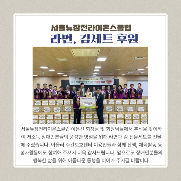 서울뉴잠전라이온스클럽 이은선 회장님 및 회원님들께서 추석을 맞이하여 저소득 장애인분들의 풍성한 명절을 위해 라면과 김 선물세트를 전달해 주셨습니다. 아울러 주간보호센터 이용인들과 함께 산책, 체육활동 등 봉사활동에도 참여해 주셔서 더욱 감사드립니다. 앞으로도 장애인분들의 행복한 삶을 위해 아름다운 동행을 이어가 주시길 바랍니다.