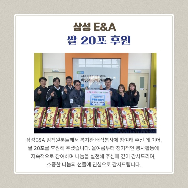 삼성E&A 임직원분들께서 복지관 배식봉사에 참여해 주신 데 이어, 쌀 20포를 후원해 주셨습니다. 올여름부터 정기적인 봉사활동에