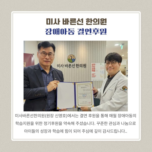 미사바른선한의원(원장 신영호)에서는 결연 후원을 통해 매월 장애아동의 학습지원을 위한 정기후원을 약속해 주셨습니다. 꾸준한 관심과 나눔으로 아이들의 성장과 학습에 힘이 되어 주심에 깊이 감사드립니다..