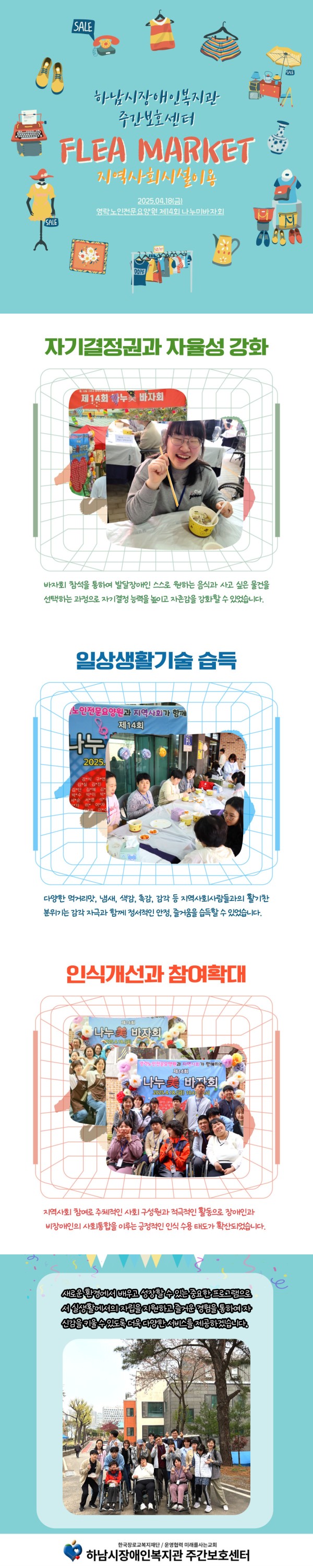 바자회 참석을 통하여 발달장애인 스스로 원하는 음식과 사고 싶은 물건을 선택하는 과정으로 자기결정 능력을 높이고 자존감을 강화할 수 있습니다.