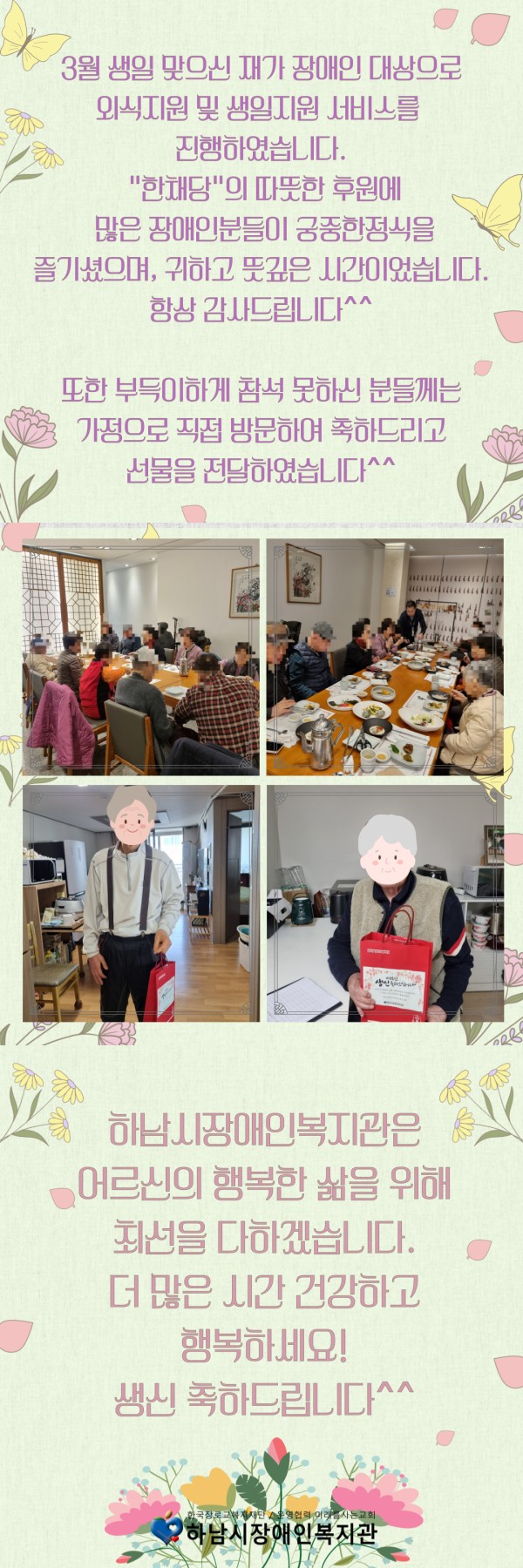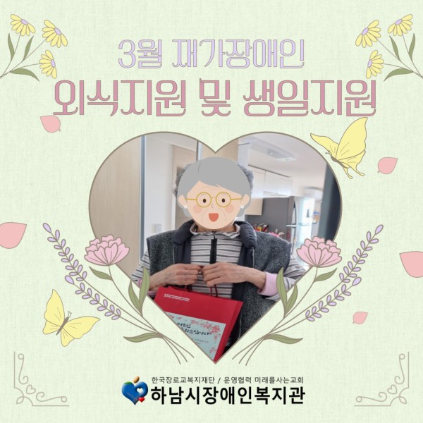 지역사회개발 3월 재가장애인 외식지원 및 생일지원 페이지 정보 작성자 하남시장애인복지관 작성일25-03-21 14:10 조회수131 본문 자세히 보기자세히 보기3월 재가 장애인 외식지원 및 생일지원 3월 생일 맞으신 재가 장애인 대상으로외식지원 및 생일지원 서비스를 진행하였습니다. "한채당"의 따뜻한 후원에 많은 장애인분들이 궁중한정식을즐기셨으며, 귀하고 뜻깊은 시간이었습니다.항상 감사드립니다^^또한 부득이하게 참석 못하신 분들께는가정으로 직접 방문하여 축하드리고선물을 전달하였습니다^^하남시장애인복지관은어르신의 행복한 삶을 위해 최선을 다하겠습니다.더 많은 시간 건강하고행복하세요!생신 축하드립니다^^ 목록 이전글 대기자프로그램 '옹기종기 조물조물' 진행 25.03.21 다음글 [직업능력개발팀] 25년 3월 사업체 견학 ~ ♬ 25.03.18