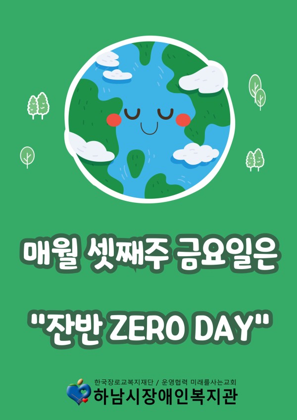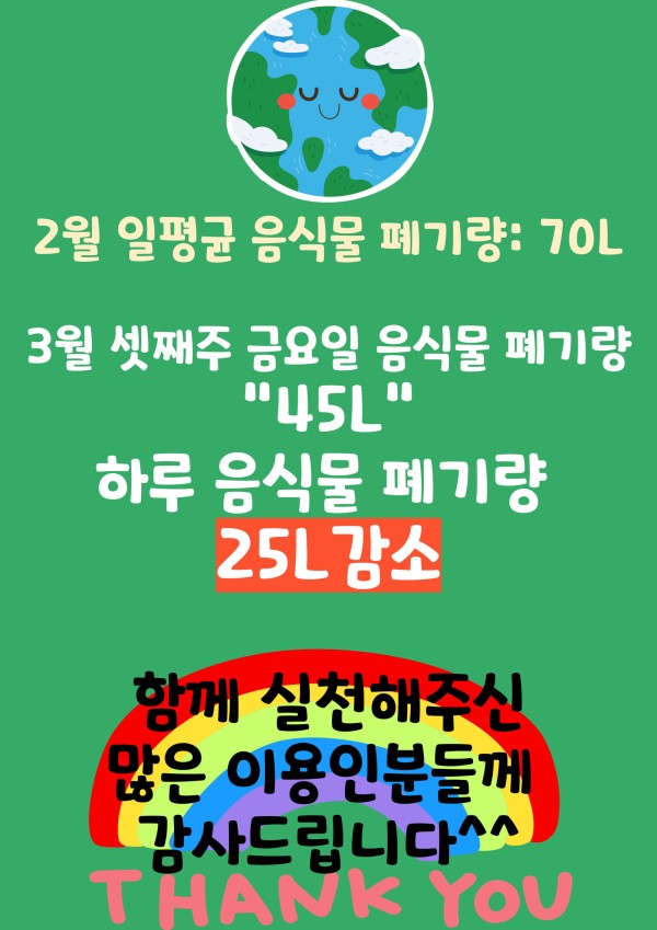 경영지원 "잔반 ZERO DAY" 페이지 정보 작성자 하남시장애인복지관 작성일25-03-25 09:53 조회수150 본문 자세히 보기자세히 보기자세히 보기자세히 보기 "잔반 ZERO DAY"매월 셋째주 금요일은 잔반" ZERO DAY"음식물 쓰레기를 20% 줄이면? * 온실가스 배출량 감소 * 에너지 절약2월 일평균 음식물 폐기량 : 70L3월 셋째주 금요일 음식물 폐기량: 45L 하루 음식물 폐기량 45L 감소함께 실천해주신 많은 이용인분들께 감사드립니다^^ 목록 이전글 돌고도네이션 따뜻한 한끼 쌀후원 25.03.25 다음글 청년대학 주간뉴스 25.03.21
