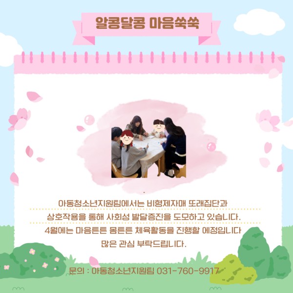 4월에는 마음튼튼 몸튼튼 체육활동을 진행할 예정입니다.