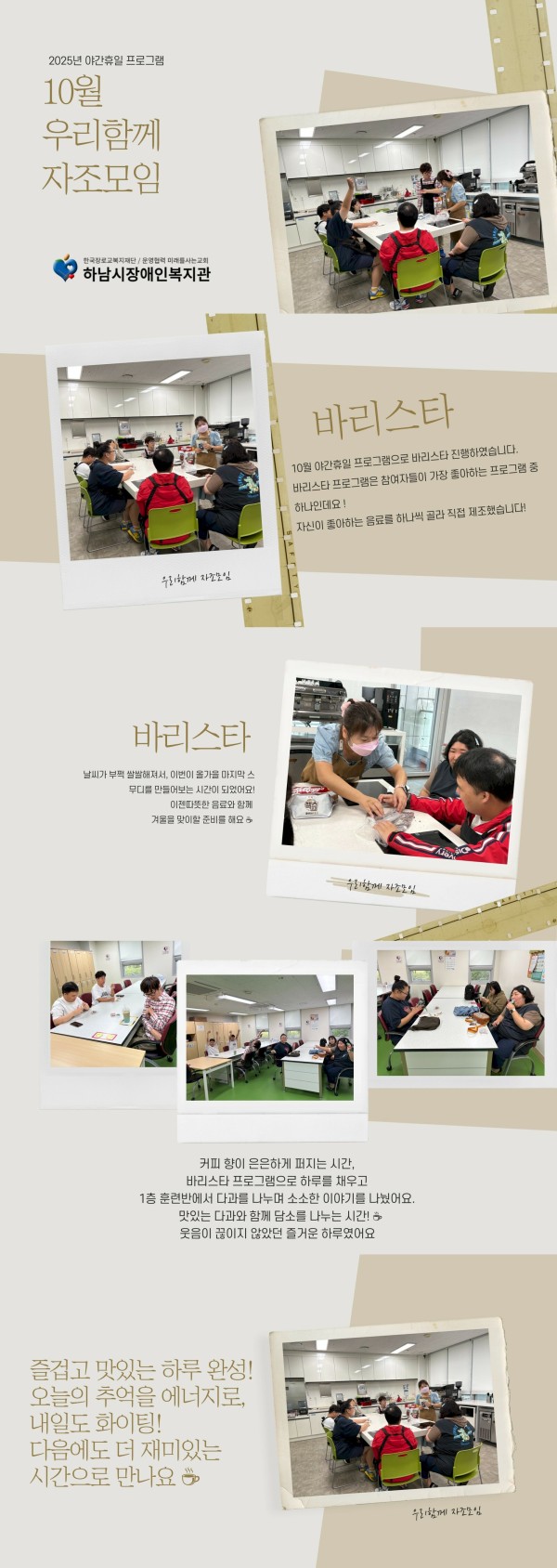 커피 향이 은은하게 퍼지는 시간, 바리스타 프로그램으로 하루를 채우고 1층 훈련반에서 다과를 나누며 소소한 이야기를 나눴어요. 맛있는 다과와 함께 담소를 나누는 시간! 웃음이 끊이지 않았던 즐거운 하루였어요