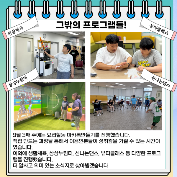 이외에 생활체육, 상상누림터, 신나는댄스, 뷰티클래스 등 다양한 프로그램을 진행했습니다.