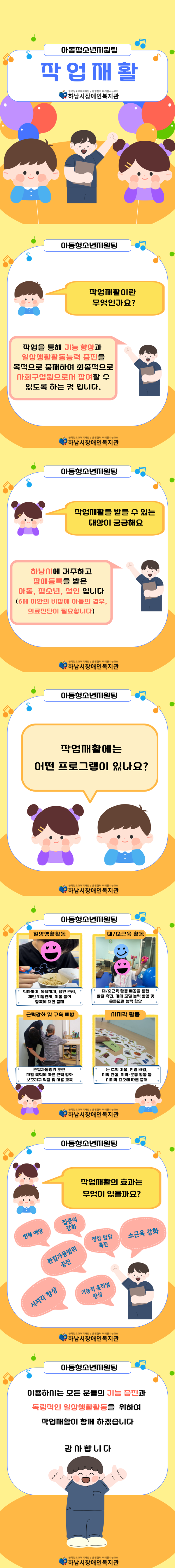 이용하시는 모든 분들의 기능 증진과 독립적인 일상생활활동을 위하여 작업재활이 함께 하겠습니다