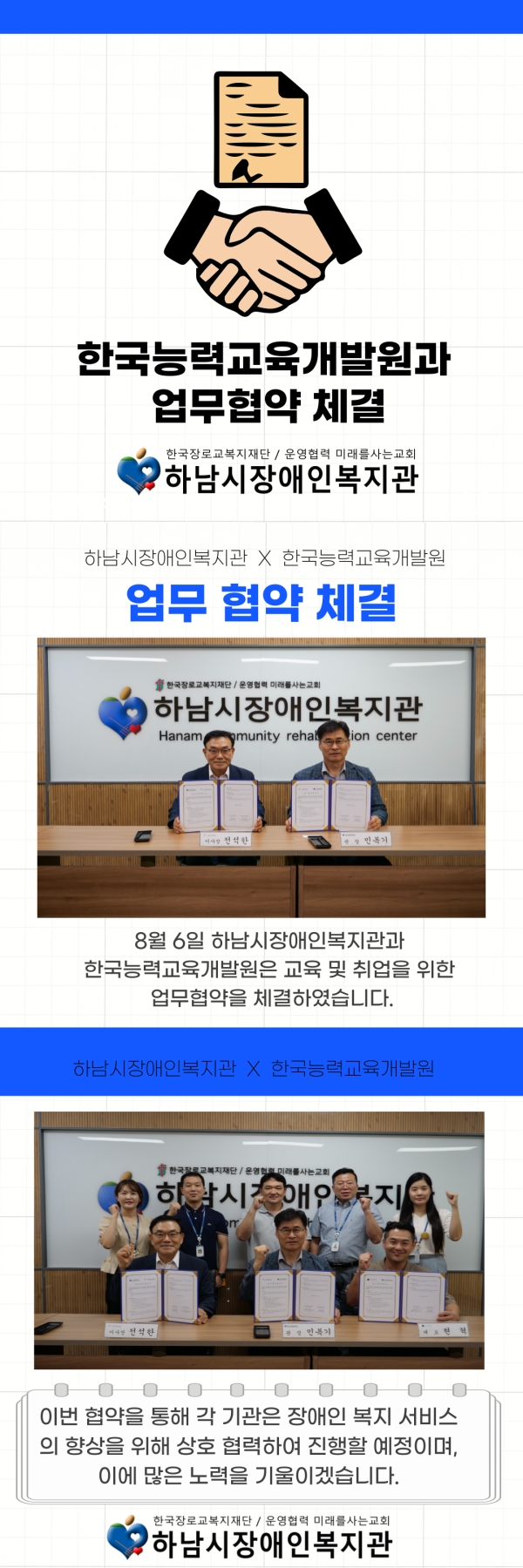 8월 6일 하남시 장애인복지관과 한국능력교육개발원은 교육 및 취업을 위한 업무협약을 체결하였습니다.