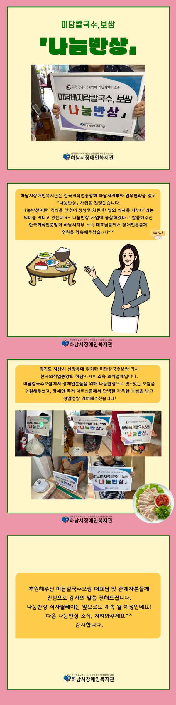 미담칼국수보쌈에서 장애인분들을 위해 나눔반상으로 맛~있는 보쌈을