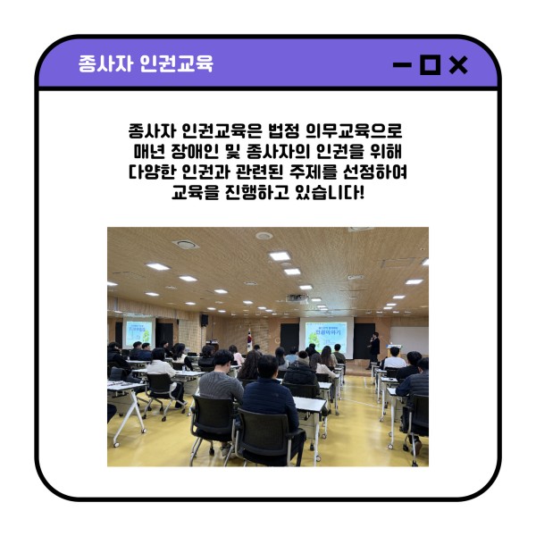 종사자 인권교육은 법정 의무교육으로 매년 장애인 및 종사자 인권을 위해 다양한 인권과 관련된 주제를 선정하여