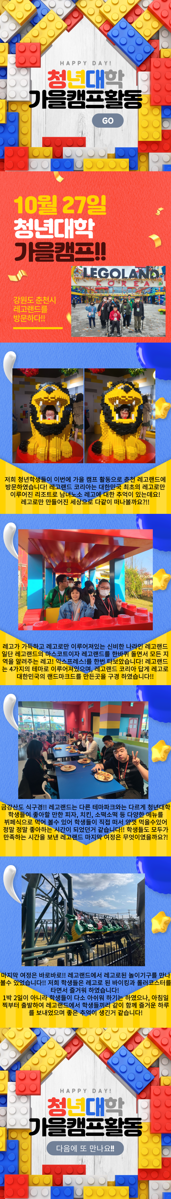 3) 저희 청년학생들이 이번에 가을 캠프 활동으로 춘천 레고랜드에 방문하였습니다! 레고랜드 코리아는 대한민국 최초로 레고로만 이루어진 리조트로 남녀노소 레고에 대한 추억이 있는데요! 레고로만 만들어진 세상으로 다같이 떠나볼까요?!!