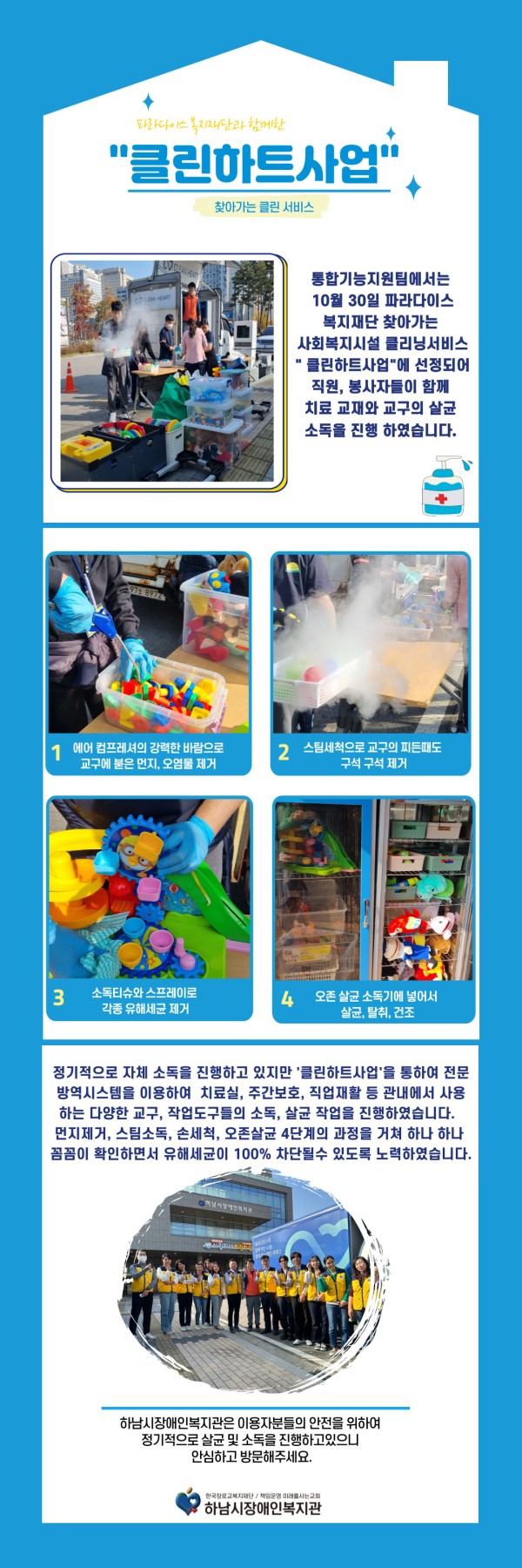 통합기능지원팀에서는 10월 30일 파라다이스복지재단 찾아가는 사회복지시설 클리닝서비스 "클린하트사업"에 선정되어 직원, 봉사자들이 함께 치료교재와 교구와 살균소독을 진행하였습니다.