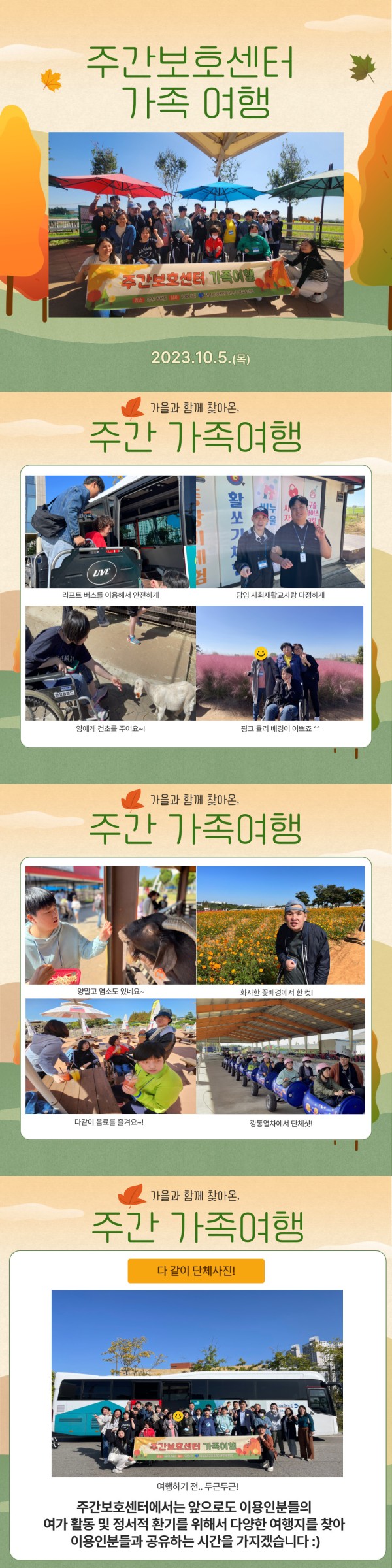 주간보호센터에서는 앞으로도 이용인분들의 여가 활동 및 정서적 환기를 위해서 다양한 여행지를 찾아 이용인분들과 공유하는 시간을 가지겠습니다 :)